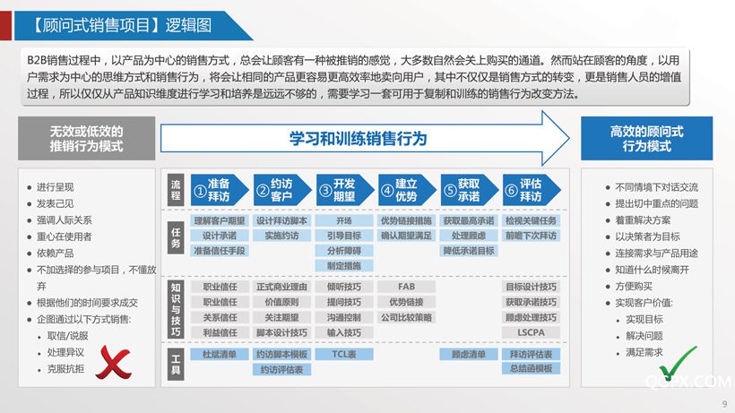 目标:B2B销售过程中,以产品为中心的销售方式,总会让顾客有一种被推销的感觉,大多数自然会关上购买的通道。然而站在顾客的角度,以用户需求为中心的思维方式和销售行为,将会让相同的产品更容易更高效率地卖向用户,其中不仅仅是销售方式的转变,更是销售人员的增值过程,所以仅仅从产品知识维度进行学习和培养是远远不够的,顾问式销售的所学范畴中,除了产品知识外,“关键销售流程”和“节点上销售技能训练”及其重要,同时客户行业知识也极其重要。